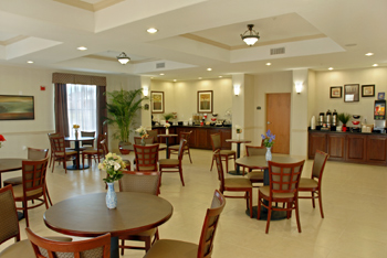 - Complimentary hot breakfast New items include Bagels topped with scrambled eggs and cheese and biscuits stuffed with sausage and gravy.